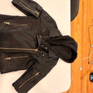 Stylish black leather jacket. Features gold zippers. Includes a detachable hood.