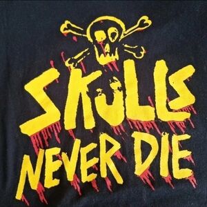 Black t-shirt featuring a bold yellow skull graphic with 'Skulls Never Die' text.