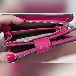 NWT, never used (I only use card cases, anymore). Second to last photo is the most accurate colour (pink, not purple!). Cross grain leather, card slots, cash slot, zippered change purse, snap closure.