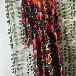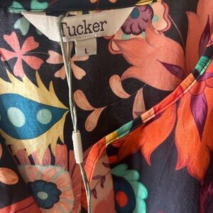 Vibrant floral dress by Tucker. Features a mix of red, green, and orange hues. Perfect for a bold statement.