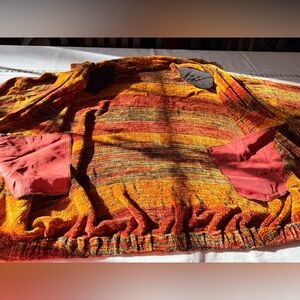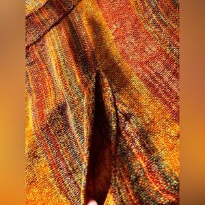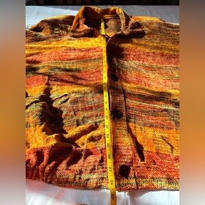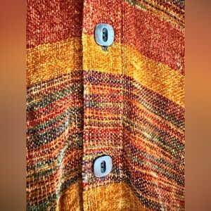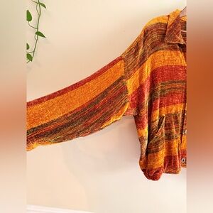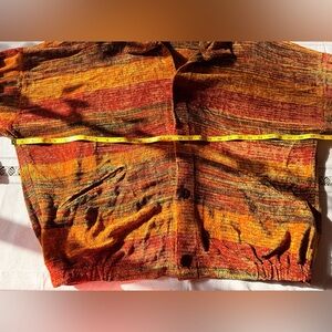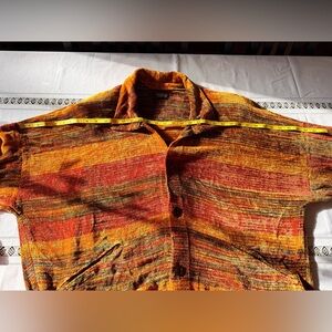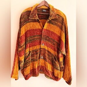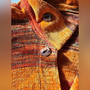 Vibrant striped jacket with button-up front. Features shades of orange, red, and yellow. Perfect for a bold look. This vintage jacket is preowned in excellent condition, please check out the pictures for more details and measurements.