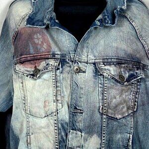 Street ready denim trucker jacket and Aaron relaxed fit jeans set with a distressed rip-and-repair design. Ideal for casual streetwear with a unique worn-in aesthetic. Hand splattered and smeared.