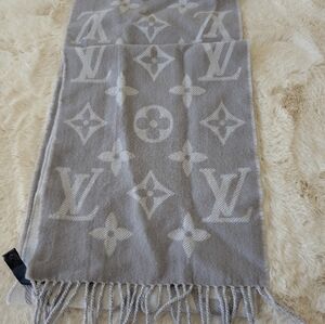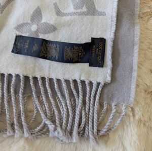Authentic Louis Vuitton monogram scarf in a beautiful soft grey and ivory colorway. Features the iconic LV monogram pattern throughout with “Louis Vuitton” signature woven into the design and finished with classic fringe edges.