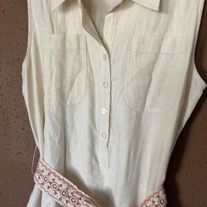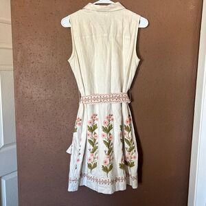 Spartina 449 sleeveless linen blend shirt dress in a cream or off-white hue, featuring beautiful pink and green floral embroidery along the hem. This button-front piece includes dual chest pockets, a classic pointed collar, and a matching embroidered tie belt to cinch the waist. The lightweight linen fabric makes it an ideal choice for warm-weather outings or coastal vacations.