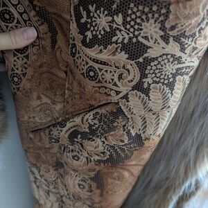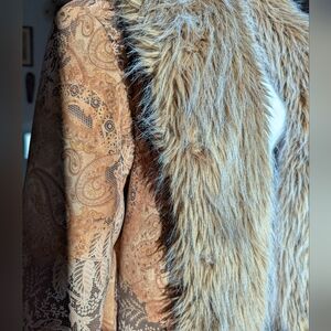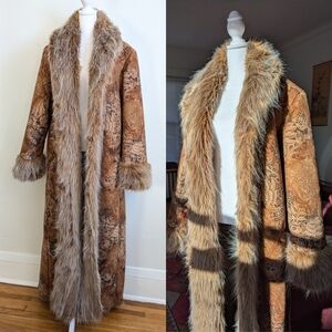 Gorgeous!!! Incredible!!! Full length afghan coat in paisley printed faux suede with signature penny lane fur trim. Rich earth tones of tan brown and orange.