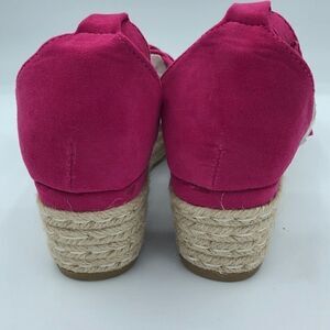 Pink strap around the ankle, braided suede, and 2” flatform heel