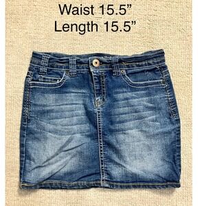 Keywords: denim skirt, mini skirt, blue jean skirt, embroidered pockets, stretch denim, casual skirt, women's skirt, size 6, blue epic, denim mini, short skirt, classic denim, stylish skirt, jean skirt