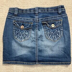 Blue Epic Denim Mini Skirt Embroidered Pockets Stretch Casual Blue Size 6