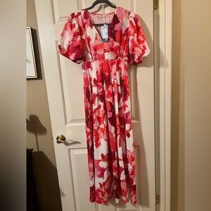 NWT Pink and White Floral Puff Sleeve V Neck High Waist Maxi Dress Size Small
