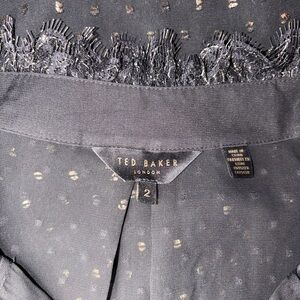 Stunning and sophisticated Ted Baker London two-piece set featuring a sheer dotted blouse and coordinating ruffle wrap-style skirt. Both pieces are a Ted Baker size 2 (approx. US 6). Can be worn together for a chic, polished look or styled separately.