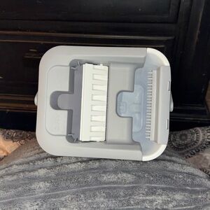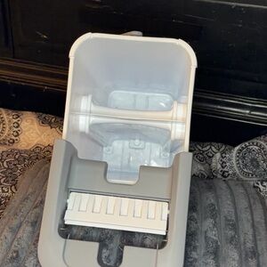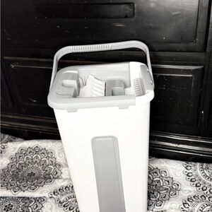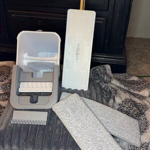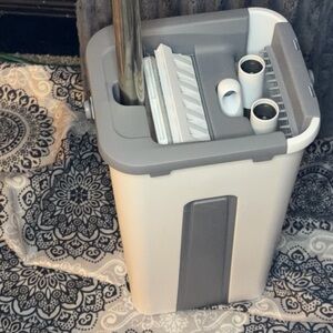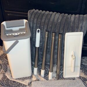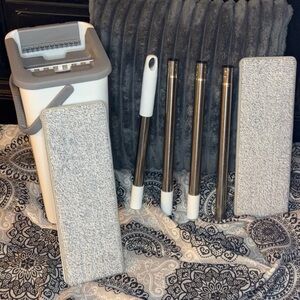 Barely used self-wringing flat mop and dual-chamber bucket system in excellent condition.