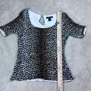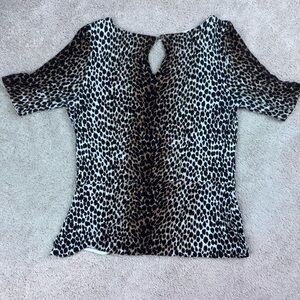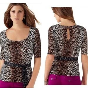 Stylish leopard print blouse. Features a polka dot belt. Perfect for versatile wear.