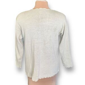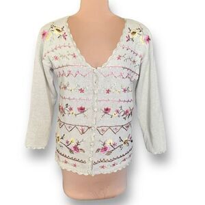 Charming cream cardigan. Features pink and yellow floral embroidery. Button-up front. Delicate lace trim.
