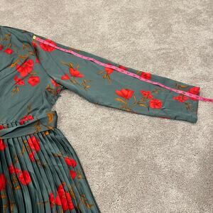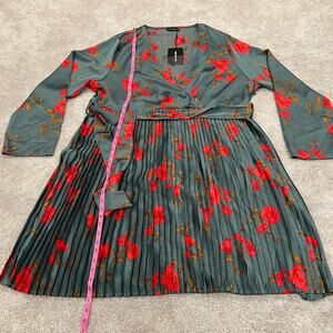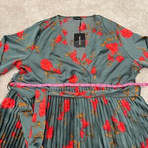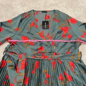 All orders ship within 1-3 business days. This women's plus size longsleeve midi dress is made by Pretty Little Thing. Color is green with various shades of red/orange flowers. The skirt is pleated—very beautiful. There is a tie at the waist . Size is 30. Excellent condition, new with tags Fabric is polyester. Make me an offer!