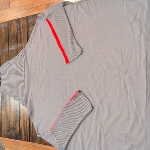 red stripe on sleeves, taupe color