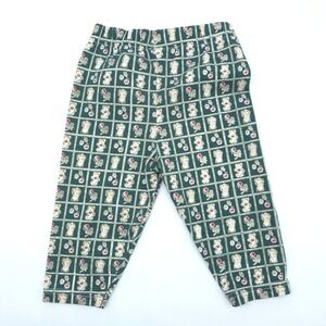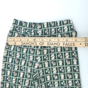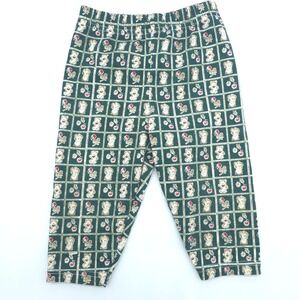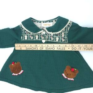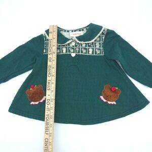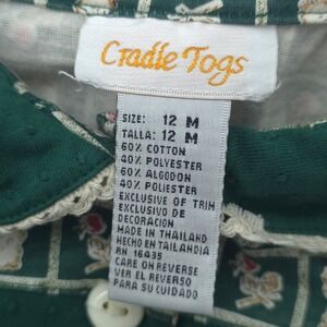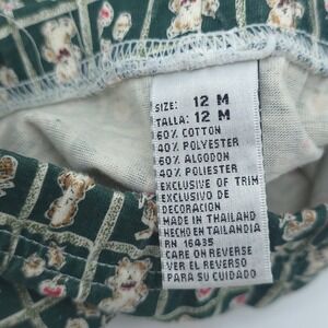 Cradle Togs two-piece set features a long-sleeve tunic top and matching elastic-waist pants. The dark green top is detailed with a textured swiss dot fabric, a lace-trimmed Peter Pan collar, and adorable teddy bear appliqués with 3D rose accents. The coordinating pants showcase an all-over grid pattern with bears and floral motifs. This charming outfit is perfect for everyday wear or special family gatherings. This item is in good pre-owned condition.