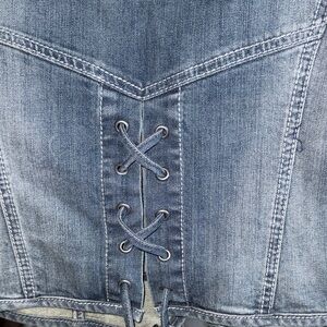 Super cute zip front with rhinestone pull. Button upper pockets. Logo words on buttons and pull. Rhinestone logo on front and angel wings with logo in rhinestones and embroidered on back. Cute lace up detail on back. Unlined.
