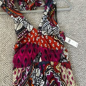 Maeve. Bold and artistic maxi dress. Features a mix of red, purple, and orange patterns. Perfect for making a statement. Halter neck.
