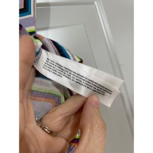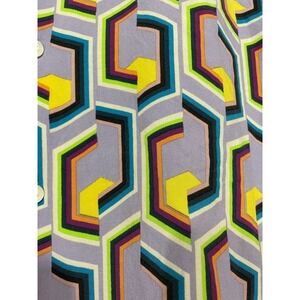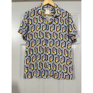 Short sleeve button-down shirt features a vibrant, all-over geometric abstract print with a retro-inspired aesthetic. Crafted from a lightweight 100% viscose fabric, it offers a soft, breathable feel and a relaxed drape. The design includes a classic pointed collar and a full button placket, making it an ideal choice for summer outings, festivals, or casual vacations. This garment is in excellent pre-owned condition.
