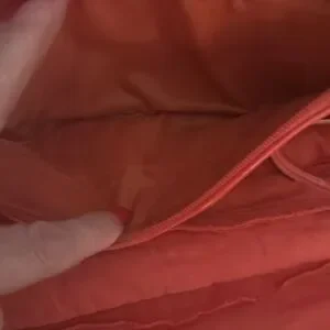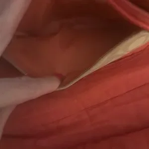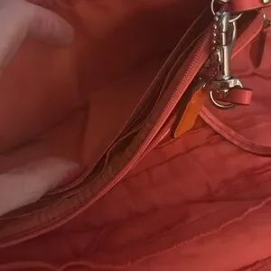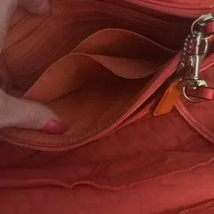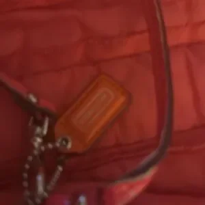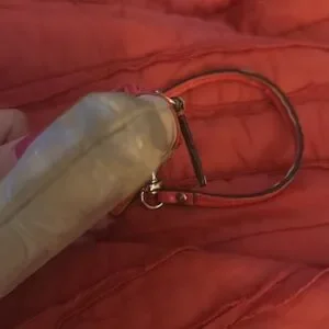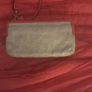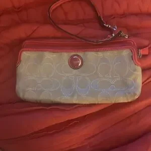 Stylish Coach wristlet in beige with coral accents. Perfect for a night out or casual day. Features signature Coach design. Strap has some shedding. Needs a good cleaning.
