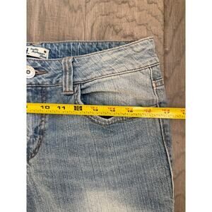 The Y2K LEI Sophia Junior Sz 11 Hiphugger Denim Bootcut Flare Embroidered jeans are a stylish and trendy addition to any woman's wardrobe. Made from a comfortable cotton blend denim, these jeans feature a flattering bootcut flare style with embroidered accents and a mid-rise waist. The 5-pocket design and distressed detailing add a touch of edginess to the overall look, making them perfect for any season. With a classic blue color and a comfortable regular fit, these jeans are a versatile choice for a variety of occasions.