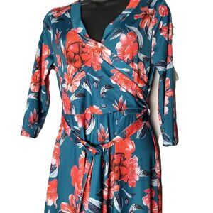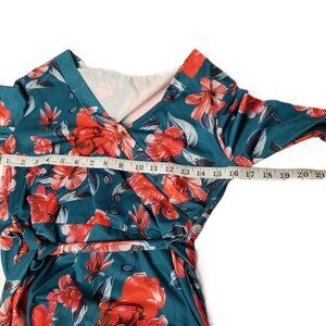 Bon Rosy Teal Floral Maxi Wrap Dress Medium Stretch Belted Boho 3/4 Sleeve