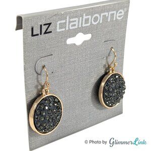 Liz Claiborne gold tone drop dangle earrings featuring circular discs accented with smokey gray rhinestones set against a dark background. The contrast gives them a subtle sparkle that works for both everyday wear and dressier occasions.