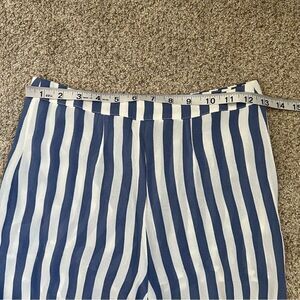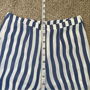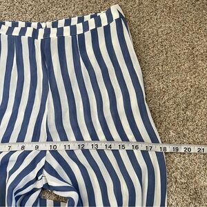 Effortless Reformation wide leg pants in a breezy blue striped chiffon-like fabric with a flattering high-rise waist and dramatic flowy silhouette. Lightweight and semi-sheer with built-in shorts lining for coverage—perfect for resort wear, summer outings, or elevated everyday styling. Gorgeous vintage-inspired 70s vibe.