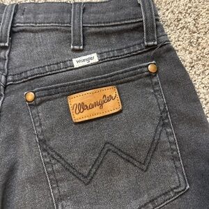 Chic Wrangler jean shorts in dark gray. Features frayed hem and classic pocket design. Perfect for casual wear.