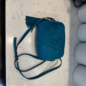 Stylish Gucci crossbody bag. Features iconic logo. Vibrant teal blue color. Perfect for any occasion.