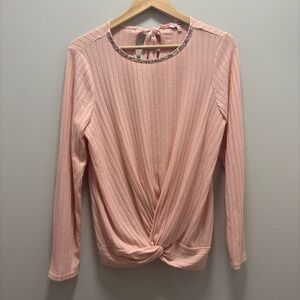 Juicy Couture Pink Ribbed Knit Top Embellished Jeweled Neckline Knotted