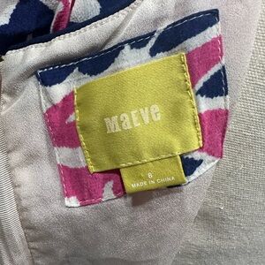 The Maeve Anthropologie Floral Bird Print Peralta Dress is a charming addition to any wardrobe, showcasing a playful blend of blue and pink hues. This fit and flare style dress, sized at 8, is designed to flatter with a short dress length that transitions effortlessly from day to evening wear.