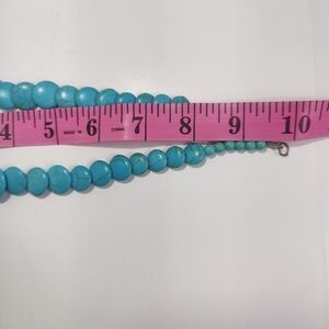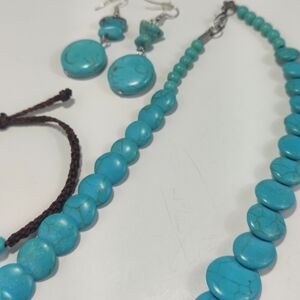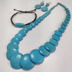 Beautiful coordinated jewelry set featuring turquoise-colored howlite stones with a bold, earthy, boho aesthetic. This matching set includes a statement necklace, dangle earrings, and an adjustable woven bracelet.