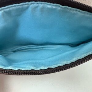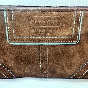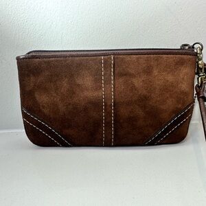 Elegant suede wristlet in rich brown with small hang tag and blue lining