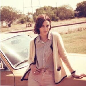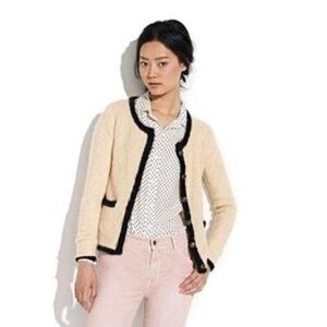Adorable and rare Alexa Chung for Madewell mohair/wool blend cardigan in the most stunning creamy oatmeal with black trim and bronze nautical buttons. Certainly giving Chanel with the awesome Madewell fit and quality.