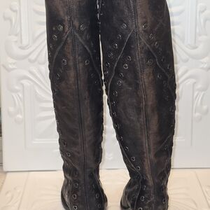 amazing boots by FRYE. natural distressed brown with grommets. that leather smell is amazing with these.
