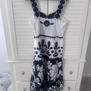 NWT! Chic midi Farm Rio dress with bold floral patterns. Scalloped neckline and tiered skirt. Perfect for stylish outings.