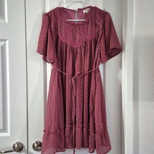 Charming babydoll style pink purple (more of a purple mauve tone) mini swiss dot dress by Umgee. Features delicate lace details and a flattering tie waist. Perfect for any occasion.