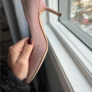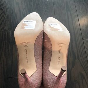 Never worn, still have tags from Nordstrom's! Purchased prior to pregnancy and now they're too small. Size 37.5, fits like 7.5. Pink shimmery fabric, there is a small snag in the fabric as shown in the photo. It's not very noticeable when worn. $1800 currently at Holt Renfrew, but this pair is hugely discounted due to imperfection. Thank you!
