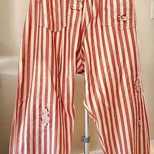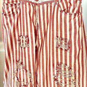 Chic pants with red and cream stripes. Features a unique distressed style. Ideal for a standout look.