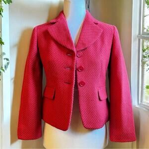New without tags Gorgeous Vibrant Coral Pink Career Tailored Wool Chevron Knit Classic Single Lapel Blazer Jacket by Ann Taylor Loft. Three Button Close. Two Decorative Front Pockets. Long Sleeves. Lined. Warm Mid Weight Fabric. Fabric has a “Fuzzy” Lofted Texture. See photos. Coral Pink. Size 0P.