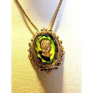 This Vintage Watermelon Glass Cameo Pendant Necklace with a 26 Chain is a unique and stylish piece of jewelry perfect for a special occasion like an anniversary. The pendant features a beautiful watermelon glass cameo set in a vintage-style pendant, creating a timeless and elegant look. Made in the United States, this necklace is a one-of-a-kind original piece that can be reversible for added versatility. The necklace is a must-have for women who appreciate fashion and vintage jewelry.