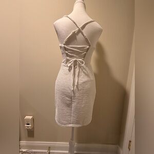 White Dress with silver sparkle. Adjustable straps and tie back. Size XS