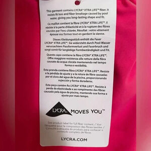 This garment contains LYCRA XTRA LIFE fiber. It resists fit loss and fiber breakage caused by pool water, giving you long lasting shape and fit!