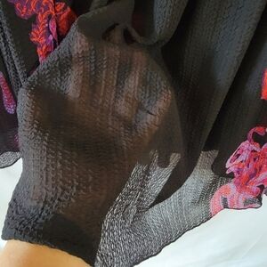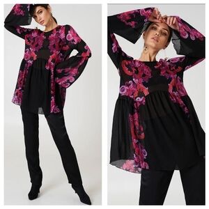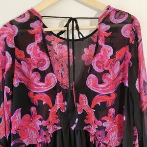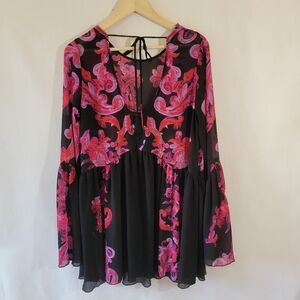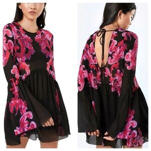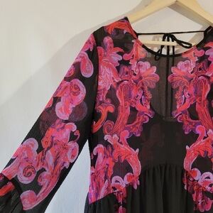 Free People Printed Symphony Smock Dress Sz S/P Black Red Floral Sheer Bohemian