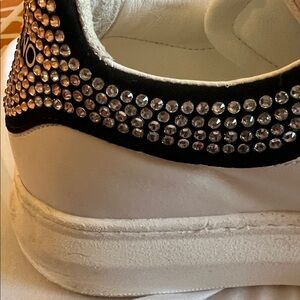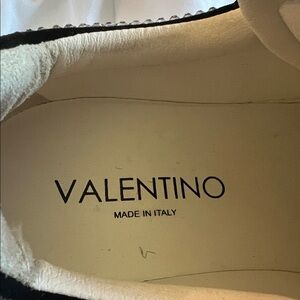 Stylish white sneakers by Valentino. Features black and silver accents. Ideal for a trendy look. Size 8 but they run small. I would buy for someone that wears a 7 or 7 1/2