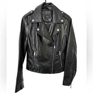 Chic and edgy faux leather jacket by Guess. Features a classic biker style with silver accents. Perfect for adding a bold touch to any outfit.