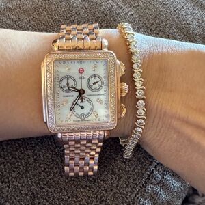 ✨ Iconic Michele Deco Diamond chronograph in rose gold-tone stainless steel with full diamond bezel and diamond hour markers.