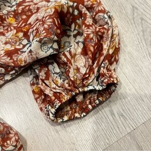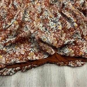 Rust deep burnt orange color with a floral pattern and metallic gold embroidered thread details. Mother of pearl like buttons. Great condition!