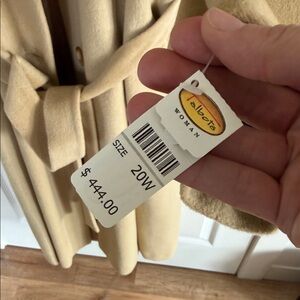 Elegant camel trench coat with a classic design. Features a tie belt and button front. Perfect for any occasion.